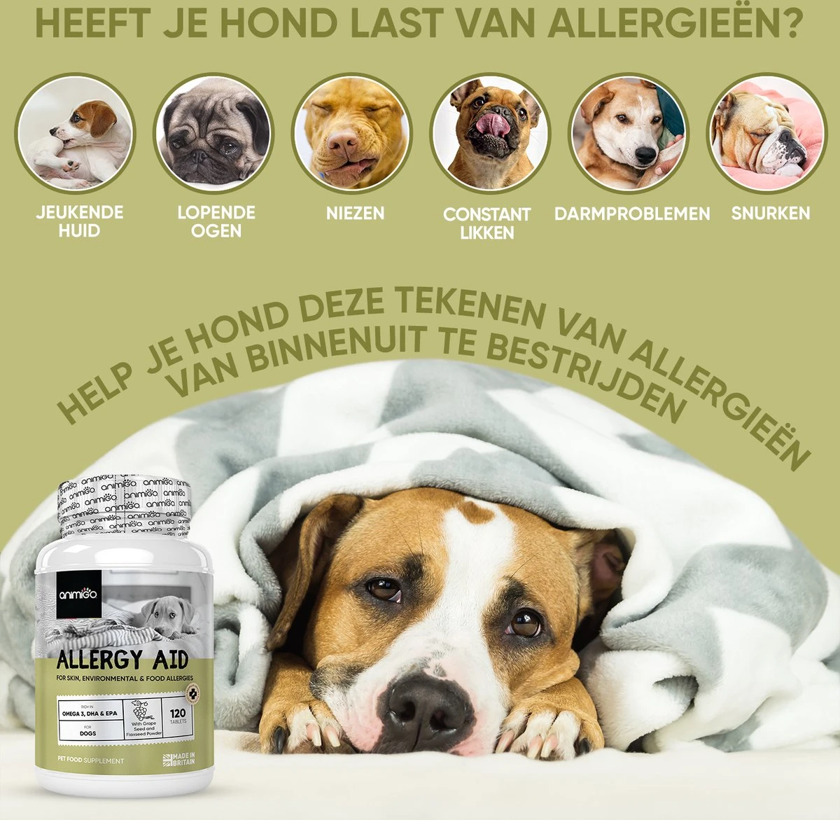 Net als mensen kunnen honden allergisch zijn. Dit Animigo anti allergie supplement helpt bij een huid-, milieu- of voedselallergie bij je hond. Deze natuurlijke tabletten ondersteunen een sterk immuunsysteem om een allergische reactie en de gevolgen hiervan zoals jeuk op de staart, rug of poten te voorkomen.