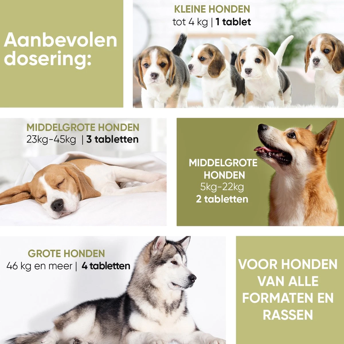 Geef voor kleine honden (tot 4 kg) 1 tablet per dag. Geef voor middelgrote honden (5 kg – 22 kg) 2 tabletten per dag. Geef voor middelgrote honden (23 kg tot 45 kg) 3 tabletten per dag. Geef voor grote honden (46 kg en meer) 4 tabletten per dag.