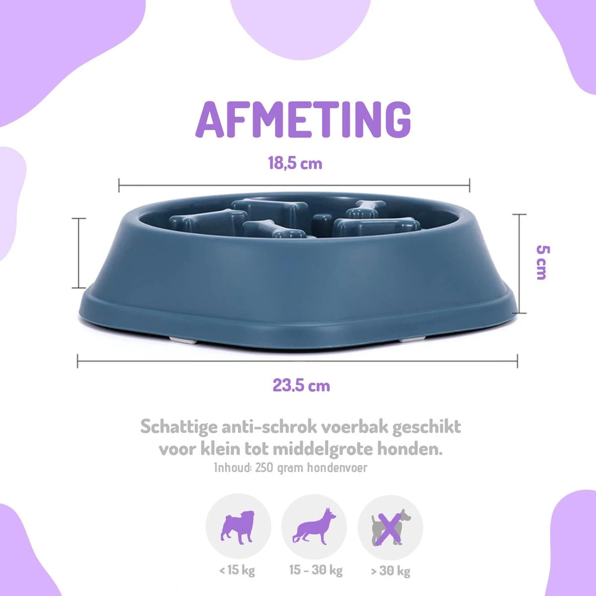 Het design is speciaal ontworpen zodat honden hun eten niet naar binnen kunnen schrokken. Dit heeft verschillende voordelen voor de gezondheid van jouw hond. Deze schattige slow bowls zijn geschikt voor kleine en middelgrote honden. De maximale inhoud van deze kommen zijn 250 gram. De onderkant van de anti schrok voerbak bevat een antislip laag. Dit zorgt ervoor dat het niet beweegt tijdens het eten. Erg handig!