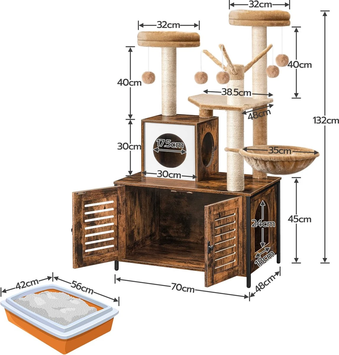 Verborgen kattenwasruimte: de onderkant van de kattentoren is een kattenbak met ademende dubbele deuren van het lamellentype, die de kat meer privacy geeft en de kamer netter maakt. Het ruime interieur (48″L x 70 B x 132 H) kan de kattenbak plaatsen om een kattentoilet te maken of worden gebruikt om kattenspullen op te bergen