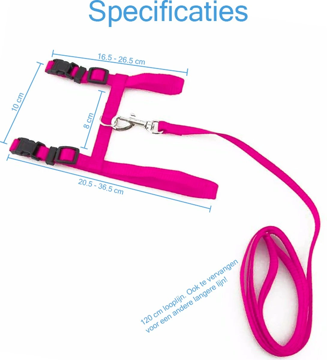 Niet moeilijk doen met afmetingen, deze one-size kattenharnas is gewoon verstelbaar.