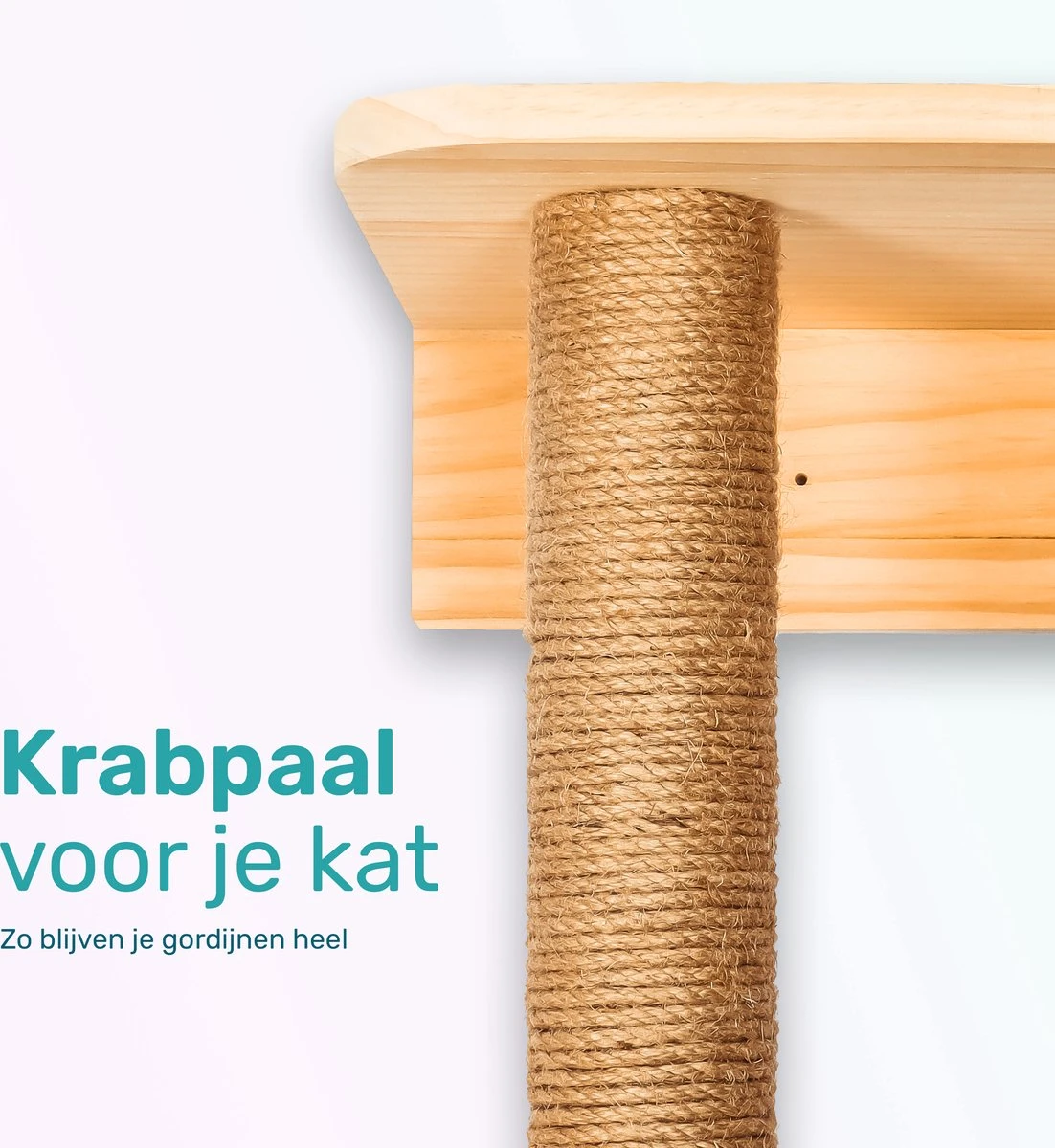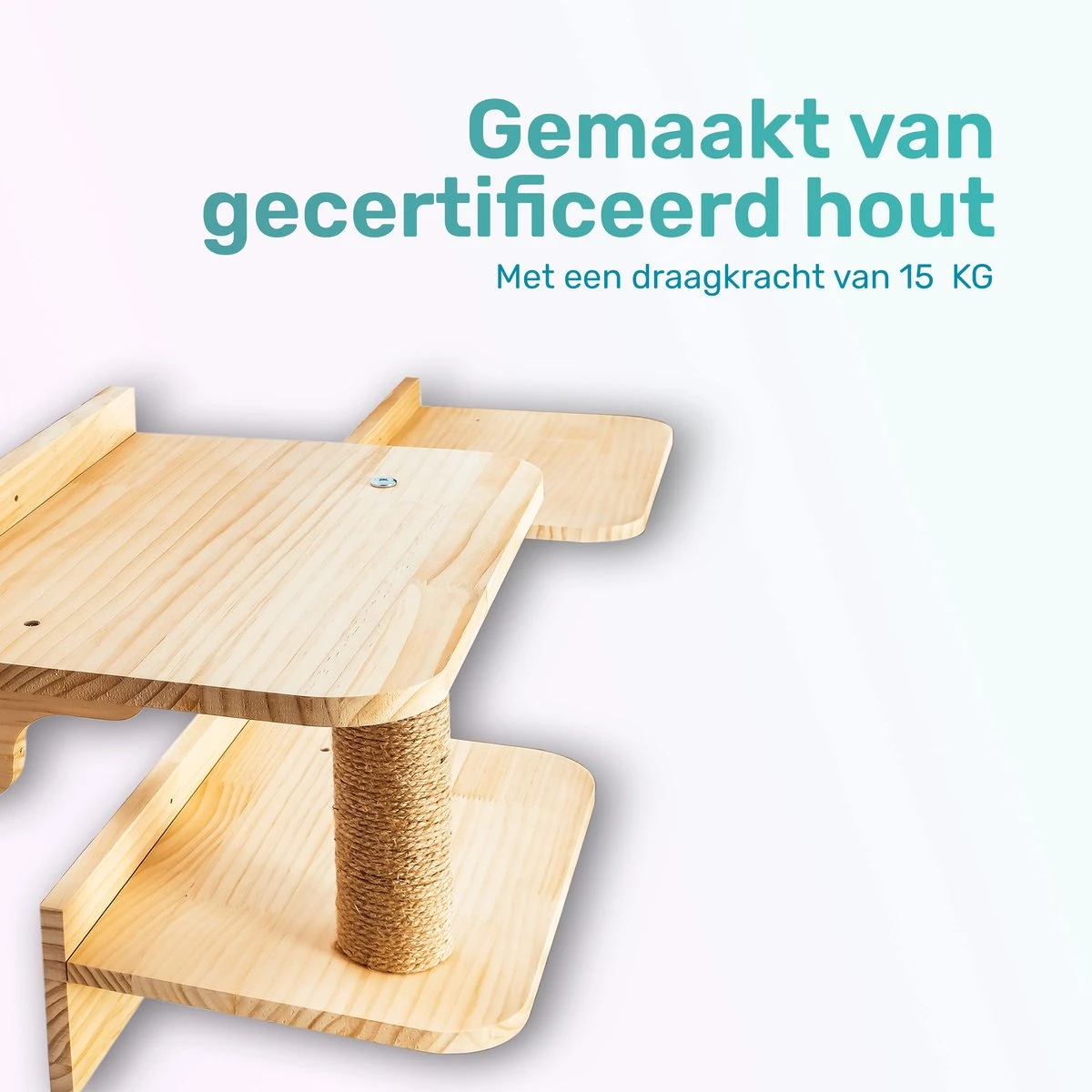 De klimwand bestaat uit 3 plateaus, een ladder en een krabpaal, zodat jouw kat heerlijk kan spelen én ontspannen. De bevestiging van de set gaat zeer eenvoudig en kan op een gewenste plek geplaatst worden. De elementen kun je op verschillende manieren bevestigen zodat jij zelf de indeling kan bepalen. Zo kun jij ervoor kiezen om de onderdelen eens in de zoveel tijd te wisselen voor een ander aanzicht.
