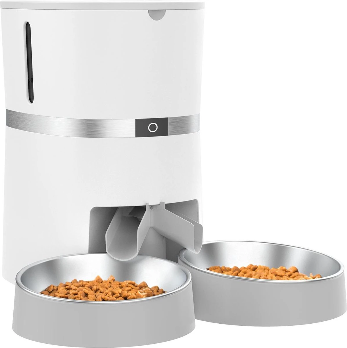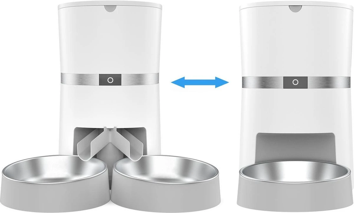 Deze automatische voerbak is zo ontworpen, dat je 1 of 2 voerbakjes kan gebruiken. Bij meerdere huisdieren kunnen 2 bakjes worden bevestigd en wordt het voer door het splitsysteem verdeeld.