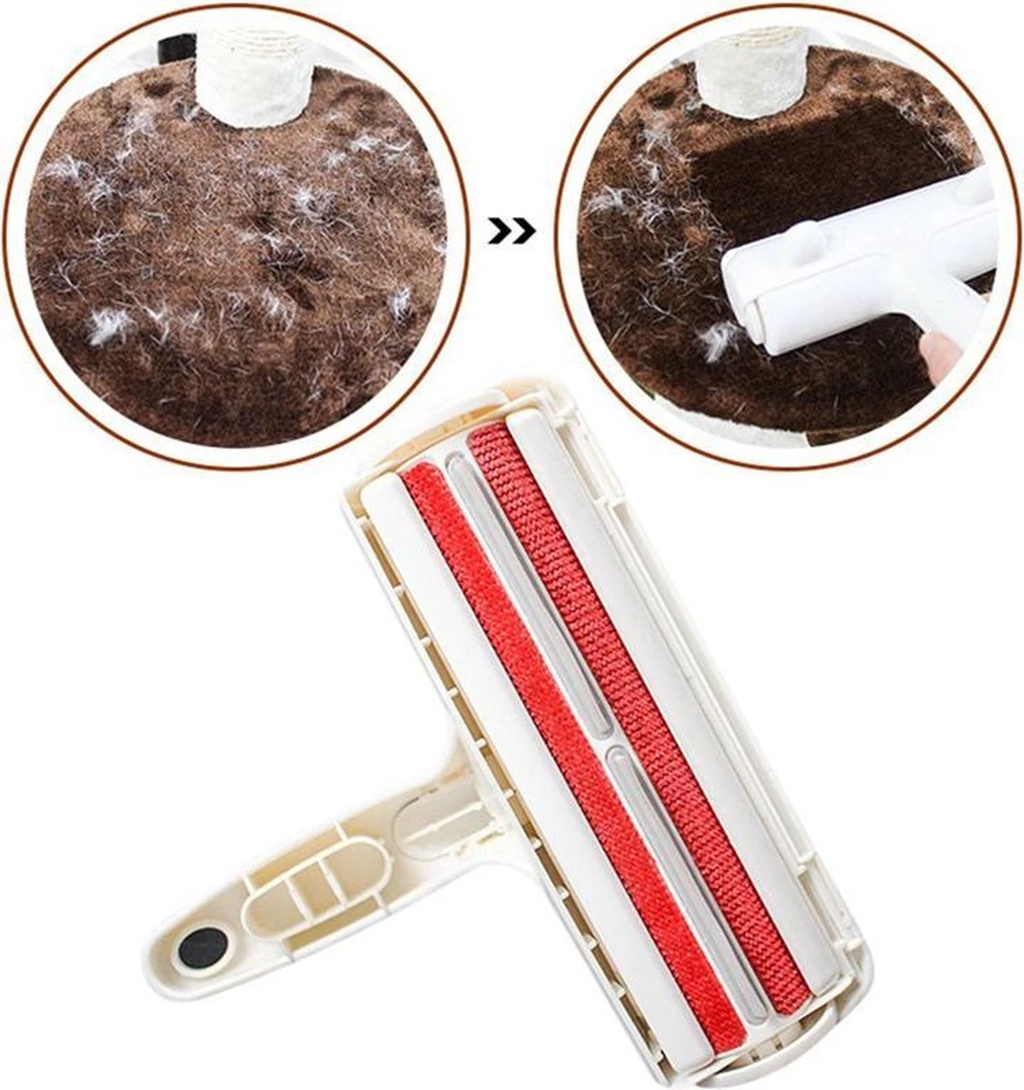 Zoals je kunt zien op de foto’s zie je dat er een opvangbakje aanwezig is in de roller. Wanneer je snel op en neer beweegt op een plek waar haren liggen komen de haren terecht in het opvangbakje. Wanneer deze vol is kun je het bakje openen en vervolgens de haren deponeren in de afvalbak. Zo Simpel is het. In de afbeeldingen vind je een handig voorbeeld hoe je de borstel het beste kunt gebruiken.