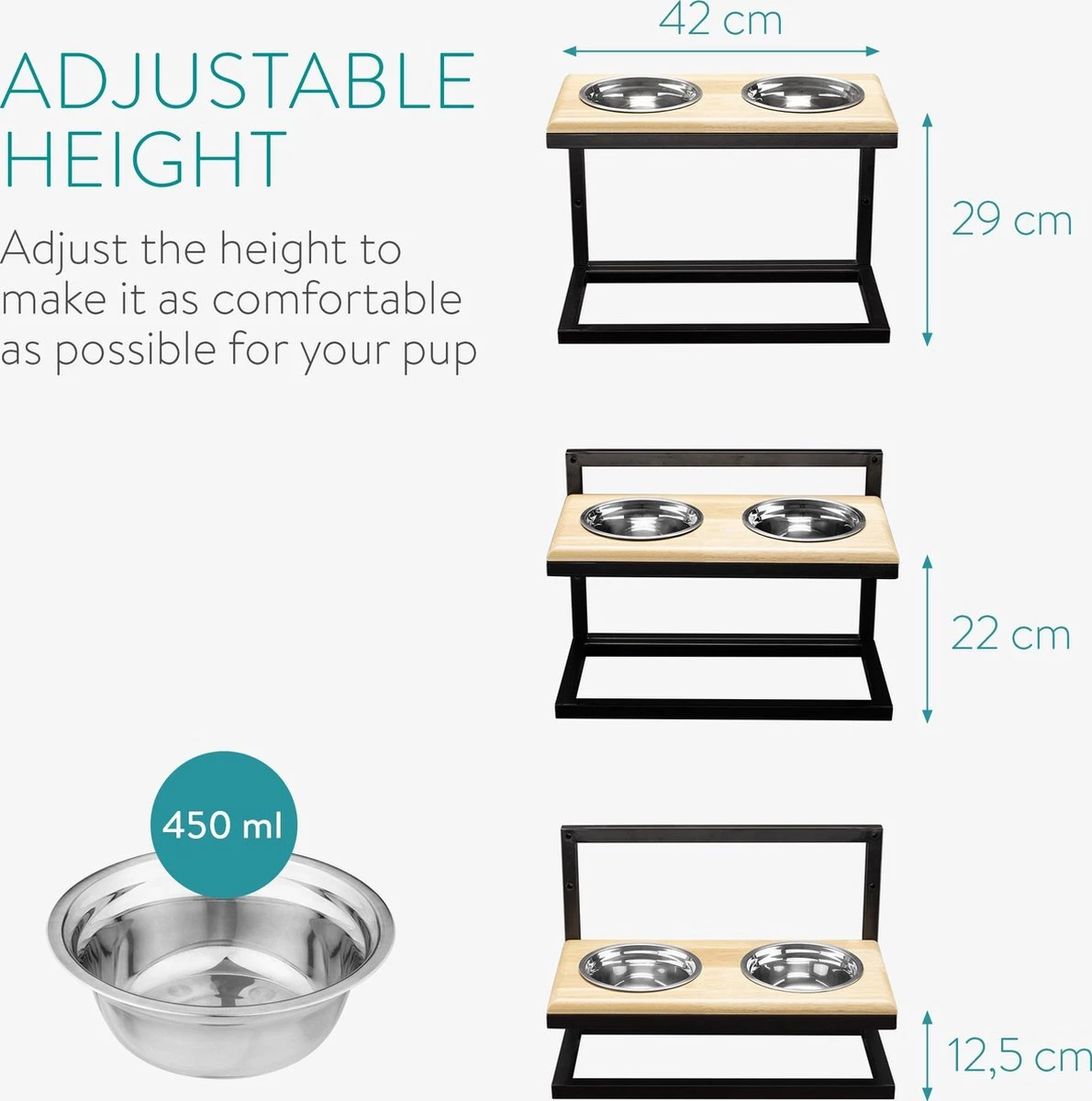 - DETAILS: Je ontvangt een voederstation gemaakt van hout met een metalen onderstel. Twee bakken van roestvrij staal worden meegeleverd, deze zijn elk 15,7 x 6 cm en hebben een inhoud van 450 ml.