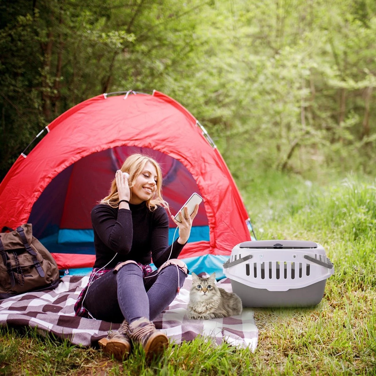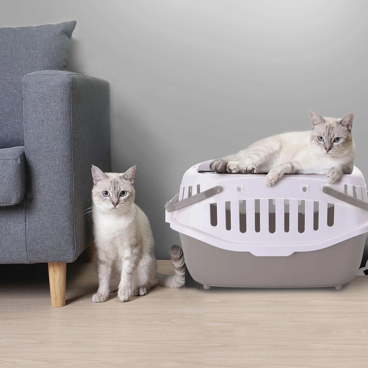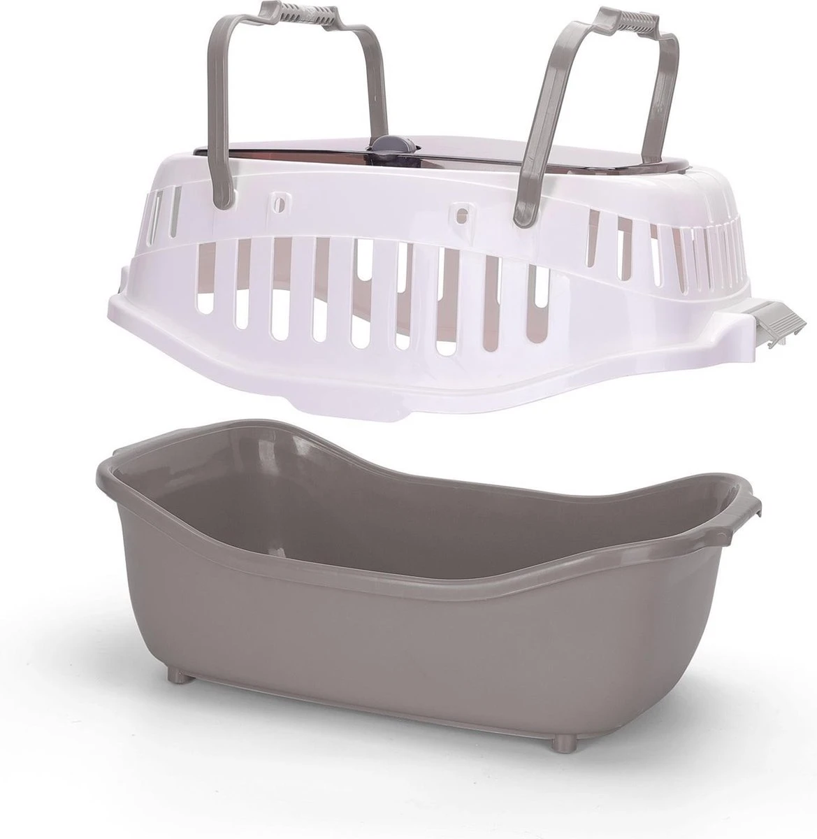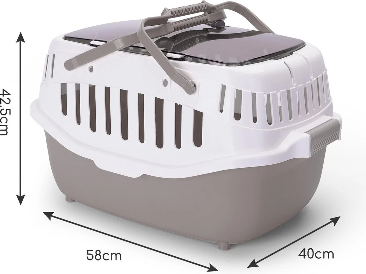 Draagbaar reishuis voor huisdieren. Het bovenste dakraam is goed afsluitbaar en eenvoudig te openen om je hondje of kat in te laden.