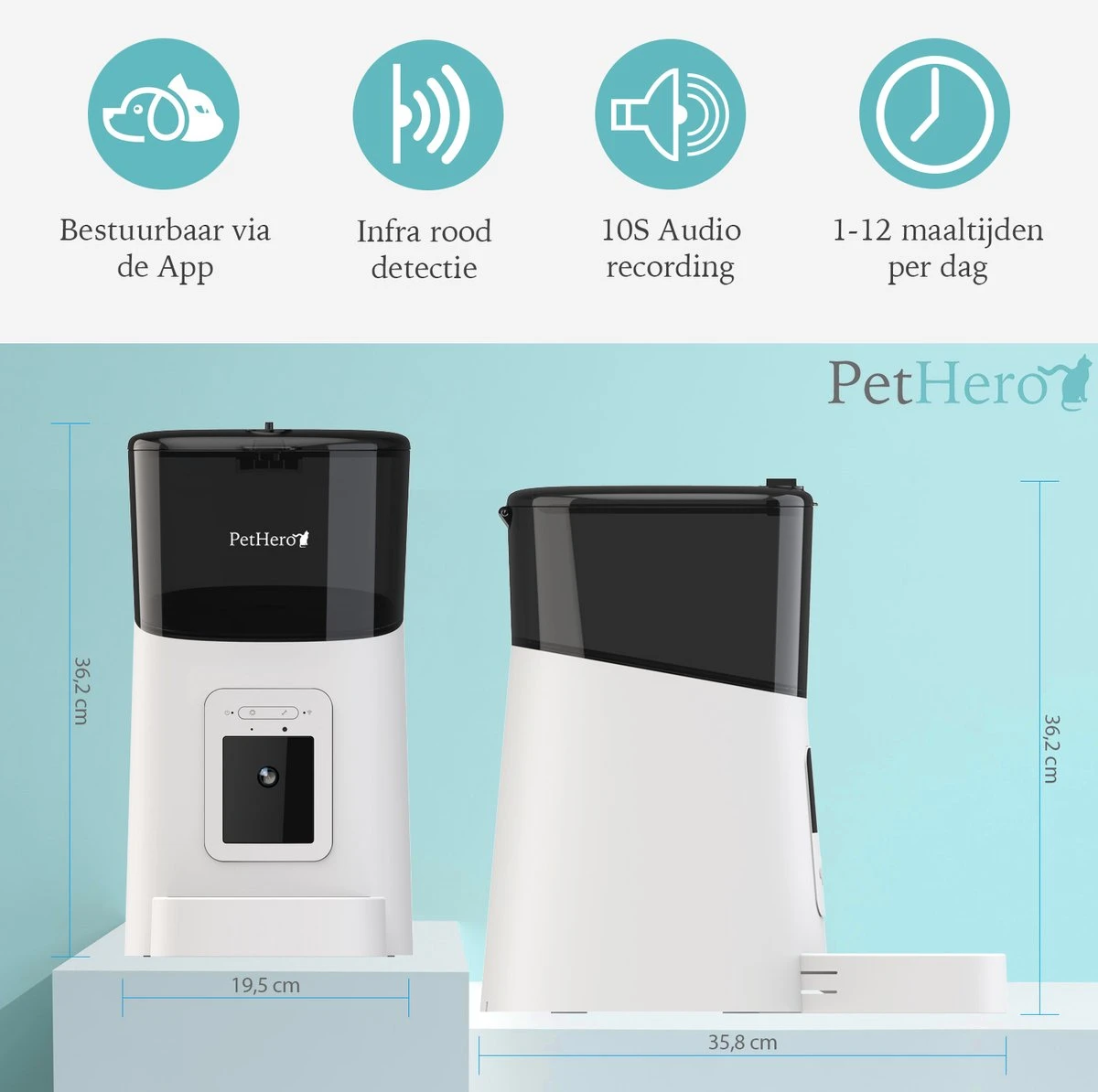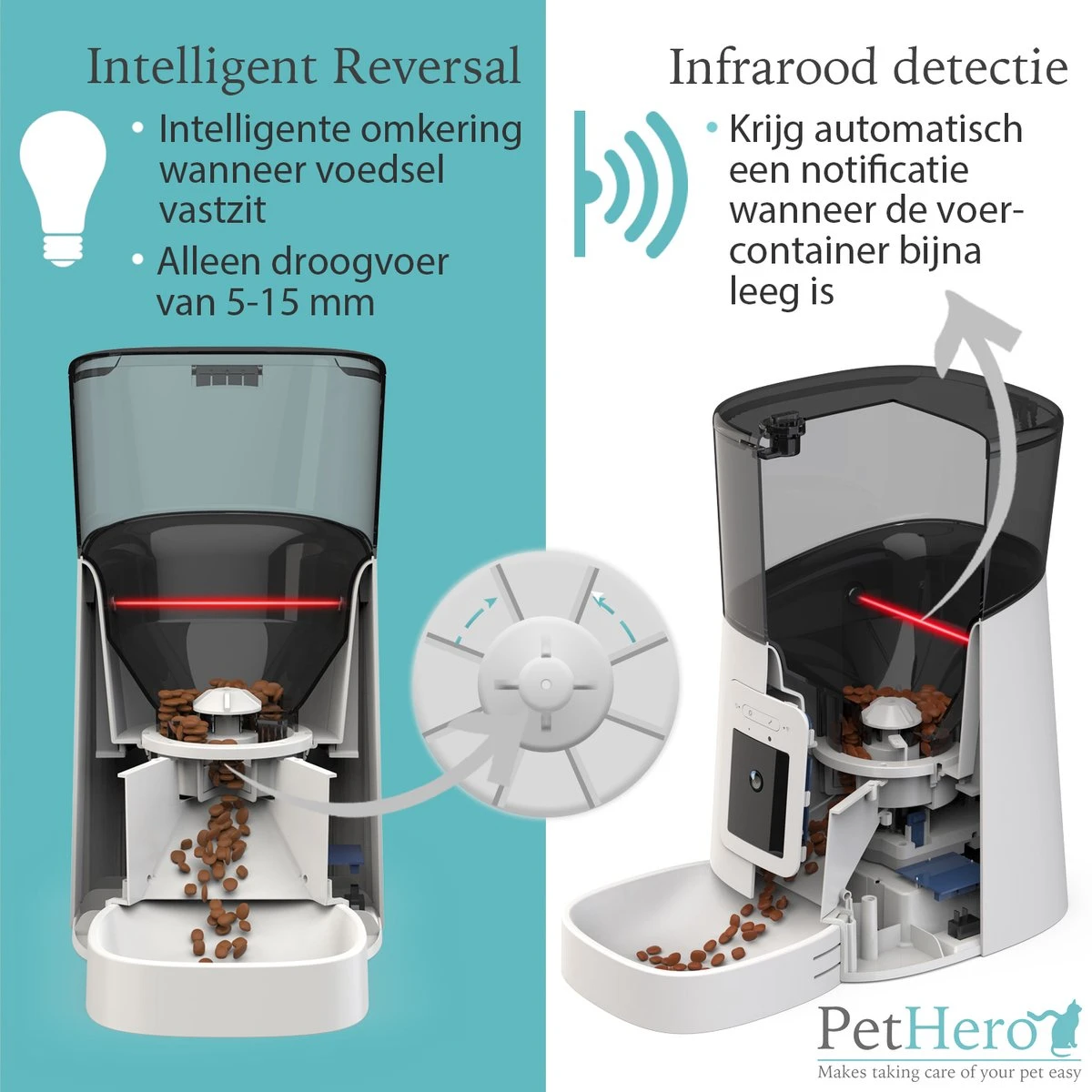 De PetHero 3 is voorzien van een modern design met verstelbare camera en is zodanig ontworpen dat het gebruiksgemak voorop staat. De voerautomaat is voorzien van een sluitbeveiliging zodat uw huisdier niet in staat is de brokken te eten buiten de geplande voertijden wanneer de voerautomaat bijvoorbeeld omgeduwd wordt. Tevens zorgt de sluitbeveiliging ervoor dat er geen vocht bij het voer komt waardoor het voer vers blijft. Dankzij “Intelligent Reversal” loopt de Petrust voerautomaat nooit vast wanneer brokken blijven vast zitten.