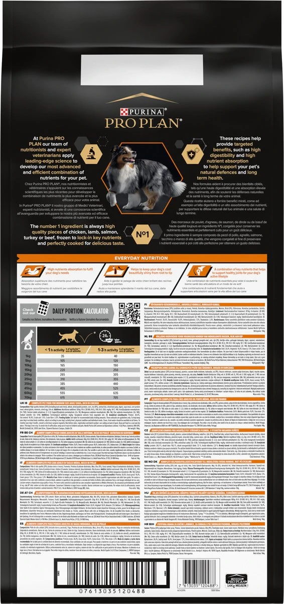 PURINA® PRO PLAN® Everyday Nutrition hondenvoer rijk aan kip draagt bij aan onderhoud van de dagelijkse gezondheid door het ondersteunen van gezonde gewrichten en een glanzende vacht van wortel tot punt. Bij PURINA PRO PLAN past ons team van voedingsdeskundigen en deskundige dierenartsen geavanceerde wetenschap toe om onze meest geavanceerde en efficiënte combinatie van voedingsstoffen voor jouw huisdier te ontwikkelen. Het nummer 1 ingrediënt is altijd stukken kip, lam, zalm, kalkoen of rundvlees van hoge kwaliteit, ingevroren om belangrijke voedingsstoffen vast te houden en perfect gekookt voor een heerlijke smaak.