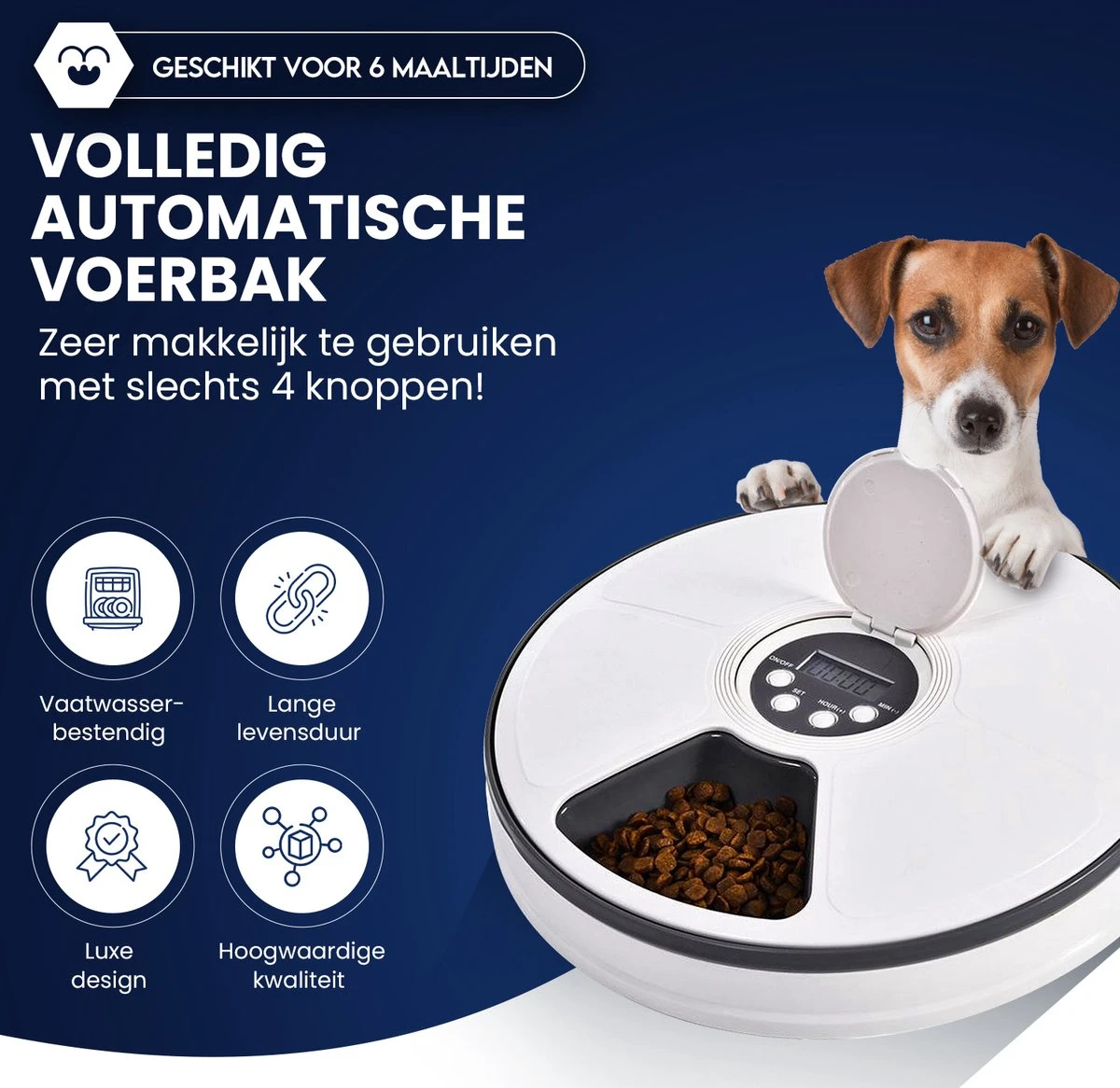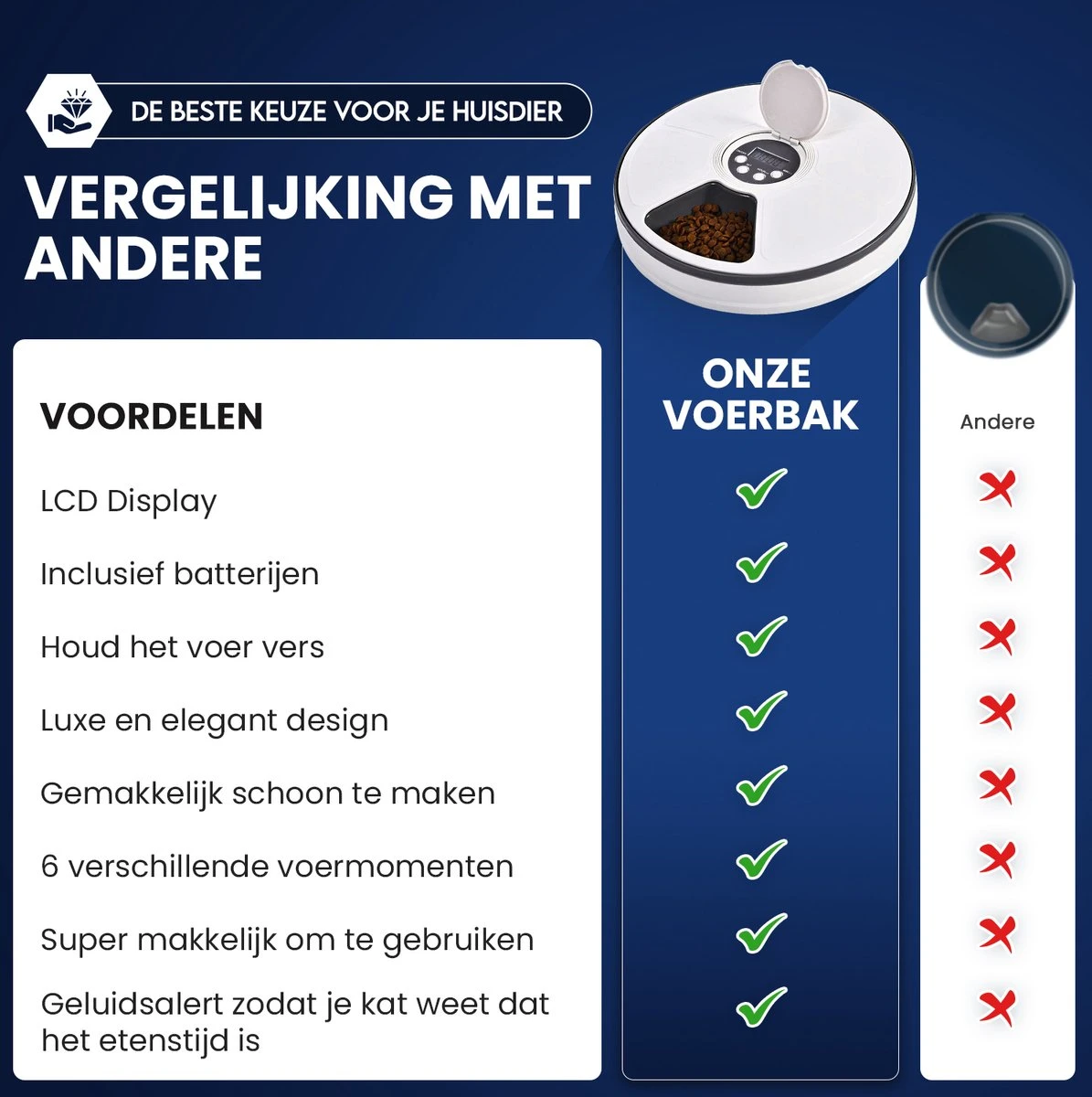 Dan is onze automatische voerbak de perfecte oplossing voor jou! Onze Automatisch Getimede Voerbak geeft jou de mogelijkheid om van huis te zijn zonder zorgen. In onze voerautomaat kunnen zes verschillende eet porties worden geplaatst en daarbij kan de tijd worden ingesteld voor het voermoment. Je kan er maximaal 60 gram of milliliter in verwerken, zodat je huisdier dagelijks gebalanceerde, verantwoorde maaltijden voorgeschoteld krijgt. Bovendien werkt onze voerautomaat zonder app, hierdoor is hij super makkelijk te gebruiken voor iedereen en heb je geen kans op storigen.