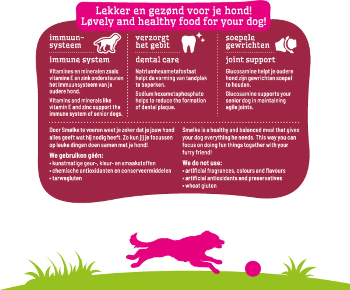 Hoewel het aan de buitenkant soms nog niet zichtbaar is, verandert er veel aan de binnenkant bij een oudere hond. Organen zoals de lever en de nieren gaan minder goed functioneren en de opname van voedingsstoffen door de darmen verloopt minder efficiënt. Oudere honden zijn niet meer zo actief als voorheen, daarom dat deze voeding minder energie bevat maar meer hoogwaardige eiwitten die de verteerbaarheid vergroten. Door de toevoeging van Glucosamine en Chondroitine wordt het behoud van soepele en gezonde gewrichten extra ondersteund. De toevoeging van vitamine E draagt bij aan het gezond ouder worden van uw trouwe vriend.