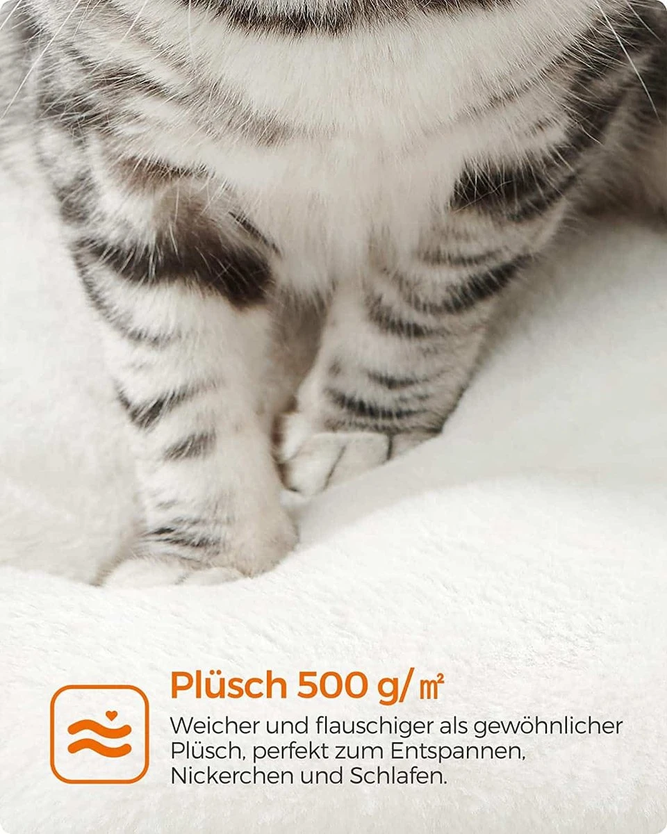 • Gemakkelijk te reinigen: de knuffelige kussens van wit pluche worden met klittenbandsluiting op de platforms of in het huisje aangebracht. Ze zijn bovendien probleemloos afneembaar en kunnen gemakkelijk worden gereinigd