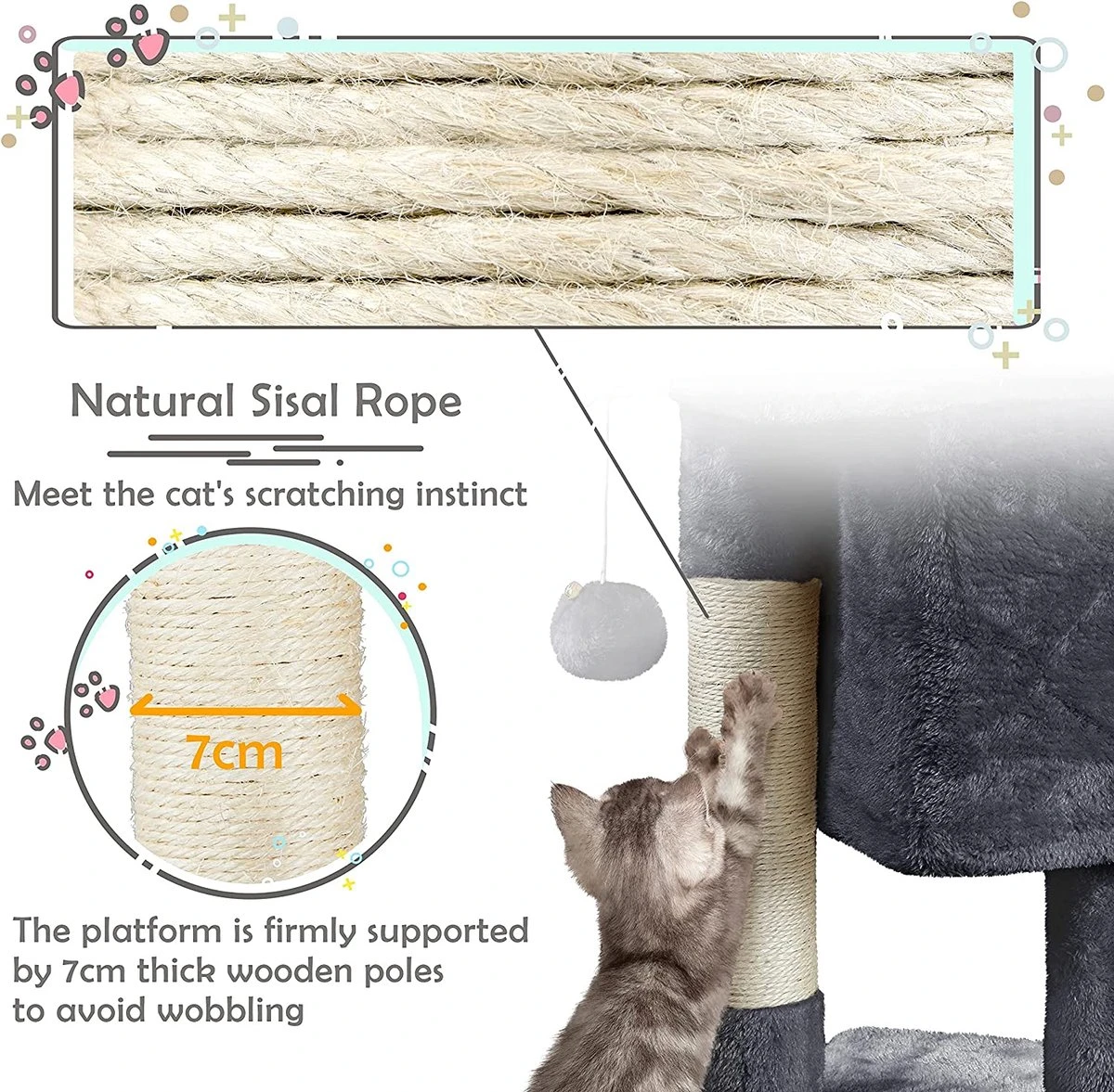 - Bescherm je meubels: 2 met sisaltouw omwikkelde palen op verschillende hoogtes dragen ertoe bij om een positief krabgedrag te bevorderen en dat je katten de klauwen van je meubels houden.